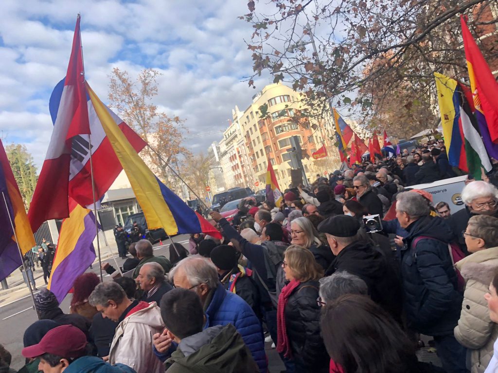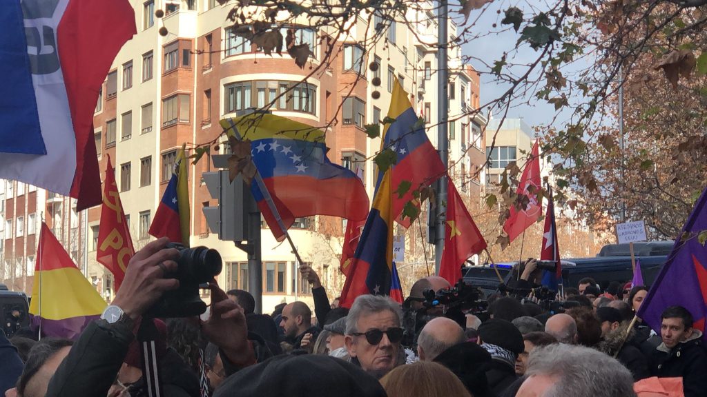 En Madrid, la protesta más numerosa se ha desarrollado en una céntrica calle frente a la sede diplomática del país agresor, donde la Internacional Antifascista -entre otras organizaciones- han concentrado a cientos de manifestantes que condenaban el ataque imperialista contra la nación suramericana, al grito de “fuera yanquis de Venezuela” y “Maduro libertad”, exigiendo el cese del secuestro del presidente venezolano.